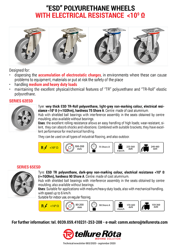 Tellure Rota ESD polyurethane wheels with electrical resistance designed for dispersing the accumulation of electrostatic charges in environments where these can cause problems to equipment or put at risk the safety of the place, handling medium and heavy duty loads, maintaining the excellent physical/chemical features of “TR” polyurethane and “TR-Roll” elastic polyurethane.