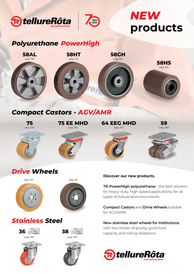The new Tellure Rota product catalog is available with the latest news: new series of wheels with coating in the new PowerHigh polyurethane compound; new series of rollers with coating in the new PowerHigh polyurethane compound; compact castors (products with reduced overall height and high flow rate, mainly for use on AGVs and AMRs)