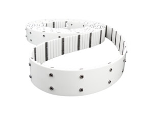 Thermoplastic polyurethane (TPU) attachments are mounted onto the timing belt and can be welded to the back at any position, giving customers full flexibility in determining the spacing. Unlike belts with false teeth, the attachment placement does not need to be a multiple of the tooth pitch.