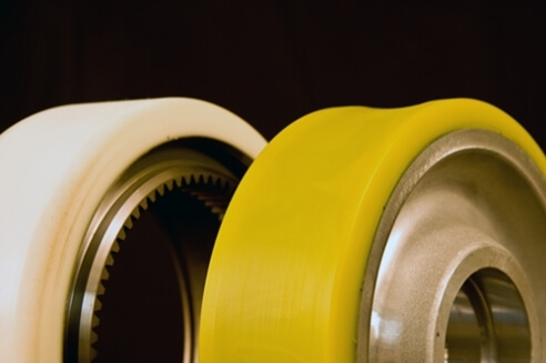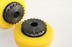 Made with electro-welded steel hub and vulkotech coating with hardness between 80 and 97sha. Also available in the version including shafts and pinions.