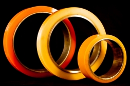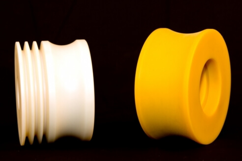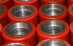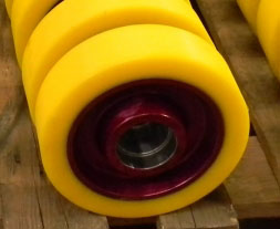 Monolithic roller in polyurethane hardness between 80 and 97sha. Rotation on ball bearings or through hole with key. Possibility of internal metal part. Ideal for pipe sliding and positioning systems.