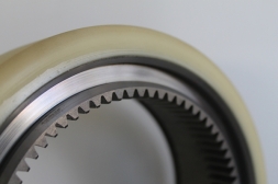 Wheel made of c45 steel with vulkotech 80sha coating with motion transmission through internal toothing. Technical coating for high speeds and medium workloads.