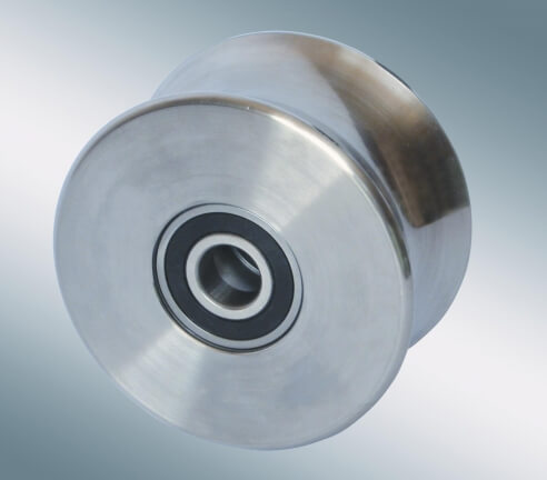 Special steel wheel with lateral guide edge. Excellent smoothness, low thrust force. Made in the neutral version with ball bearings or bore to design.