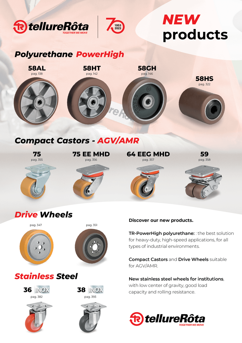 New stainless steel wheels for institutions, with low center of gravity, good load capacity and rolling resistance.