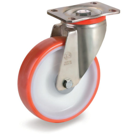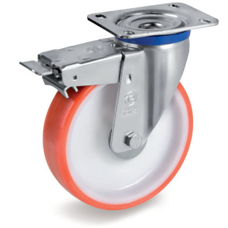 They are suitable for handling trolleys and equipments with medium loads, even on a long-term basis. They ensure operators can reduce efforts when handling trolleys. In addition, they can be easily washed for use in environments with high hygiene standards (chemical/food/… companies). They are also suitable for mechanical handling at a speed up to 6 km/h.